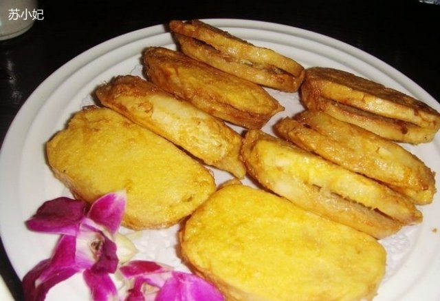 黄金臭饼,很有创意的一道菜,应该是馒头片擦过臭豆腐的汁,外面裹了蛋液过油炸的,有着淡淡臭豆腐的香味,好多年没吃过了,吃在嘴里蛮香的。