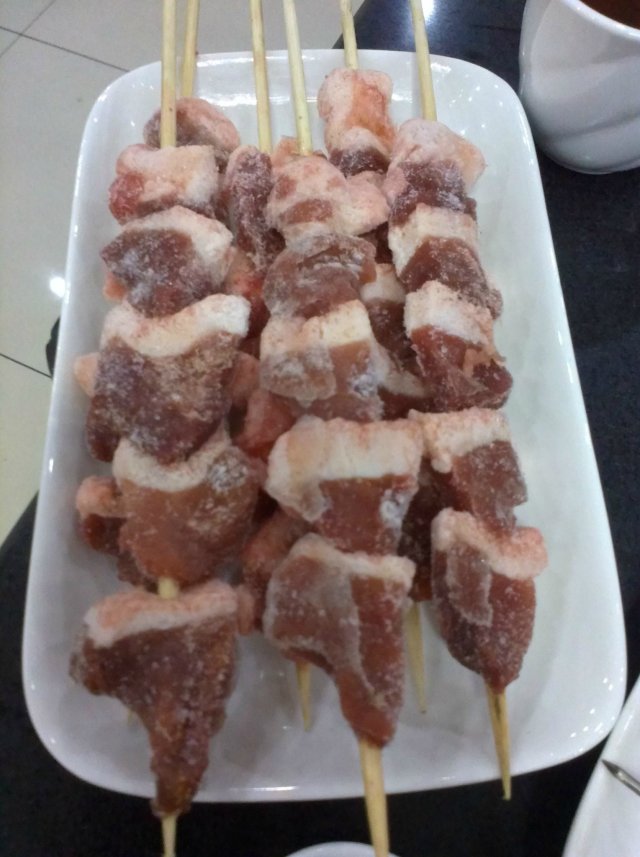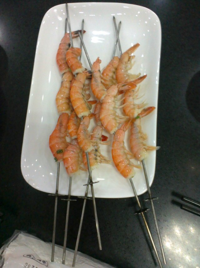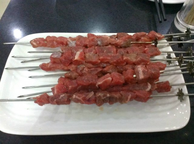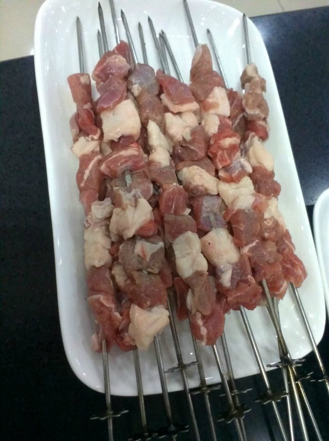 像碳烤牛肉串和孜然羊肉串这些,店家是原汁原味的串起来的,放在烤架上,涮上两边油,自己按口味撒上孜然粉。辣椒粉。胡椒粉之类的,几串烤下来后发现,料要多才够味道。店家穿精品五花肉的时候用了点技巧,肉被穿成鸡心的样子,让我在烤它之前一直以为是鸡心呢。相比之下,这三种肉类烤串中,还是五花肉的味道最好了。