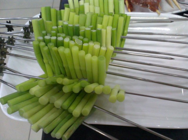 素菜类的有蒜苗、韭菜和金针菇。头一次发现蒜苗被烤了之后也很好吃的,带着淡淡焦香的蒜苗,仍旧保留着自己的清脆,也很能吸收佐料的味道,口感不错。而韭菜盒金针菇,却是我们自己非常不好掌控的两种烤物,烤久了容易焦,油刷少了,也容易焦,总之我们没有烤出一串味美的韭菜或者金针菇,不是焦掉的韭菜,就是干掉的金针菇。看来以后想吃这两样烧烤,还是交给师傅去做吧。