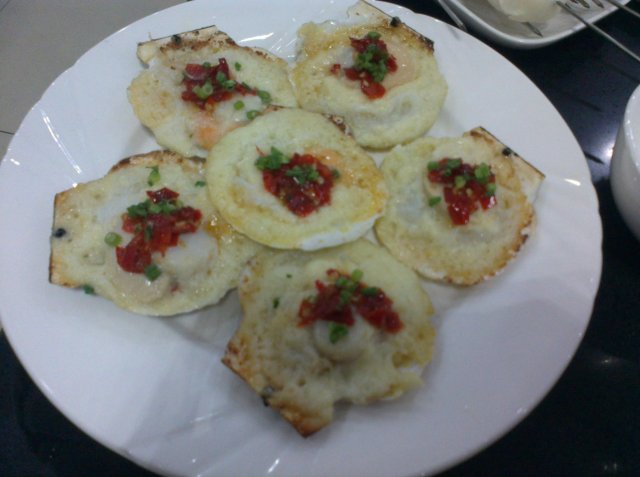 店家帮我们烤的蒜茸粉丝扇贝,蒜茸被切的细细的铺在扇贝上,下面垫着粉丝,同桌的人觉得蒜茸太多,味道有些冲了,我到觉得还可以,很刺激味蕾。