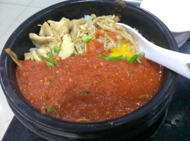 最后的主食是石锅鸡肉拌饭,估计店家是多次在石锅里加水加热了,所以拌饭真的有些湿,于是请店员重新拿回去加热一番,味道就好很多了。