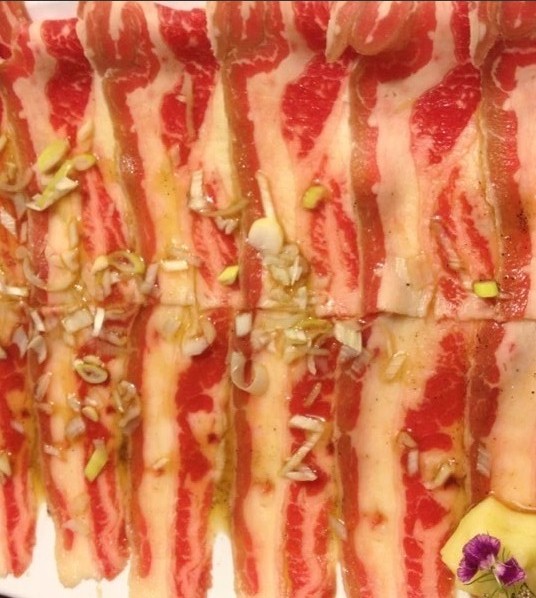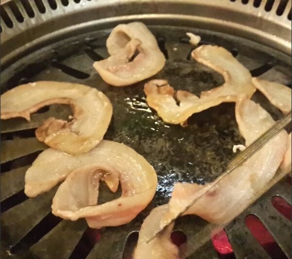 1、五花肉和培根:五花肉是那种圆片的,层次分明,一层瘦一层肥,肥瘦相间,卖相不错,肉烤出来油汪汪,吃着嫩、焦、香,口感非常好噢,肉质很新鲜。培根量大实在,看色泽是新鲜的,肉质薄厚均称,烤焦一点更好吃些,蘸料不错,考究地道,吃得津津乐道,酸甜适中。