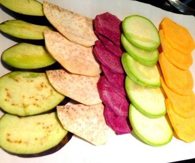 2、蔬菜拼盘:有茄子,紫薯红薯片,西葫芦片等,颜色搭配得不错,让人看着赏心悦目的,菜新鲜干爽,茄子烤出来软糯,薯片烤出来香甜,菇片烤出来筋道,各种口味与口感。