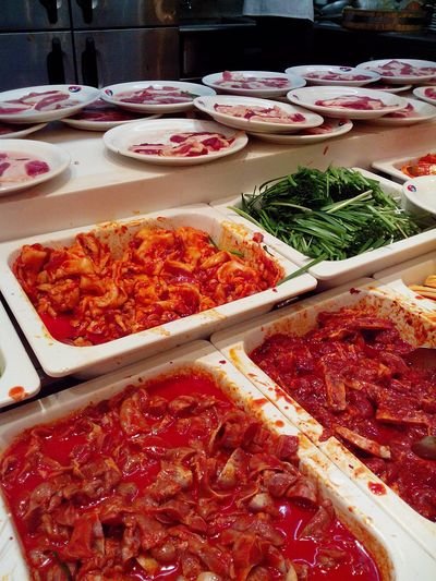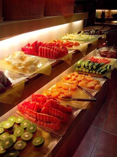 这里的东西还是蛮多的,有凉菜、热菜、煮面、水果、饮料、酒、凉面、甜品、各种肉、还有青菜、凉菜、炸的东西等等,东西很多。
