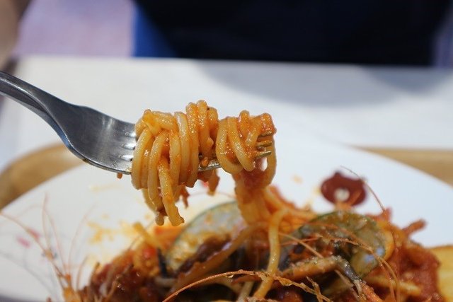 意粉掛滿醬汁,較為粗身,煮得略腍,蕃茄醬味道香濃,唔會太酸,蝦、青口不過不失啦,食落唔臭唔霉。
