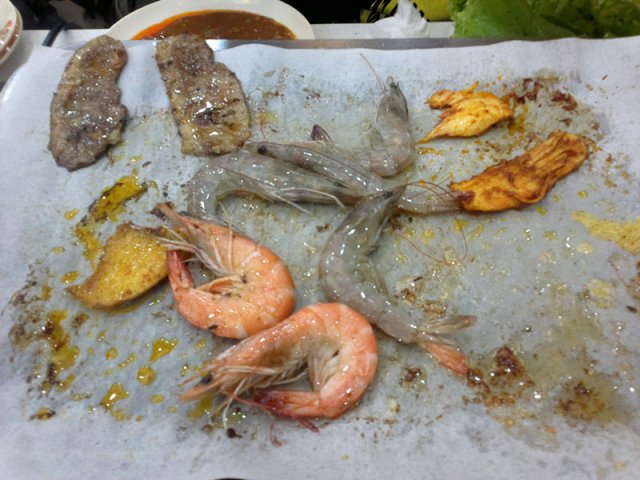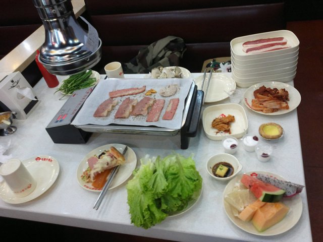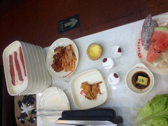 味道也不错,肉质肯定就那样的,不能那汉拿山等的放这比吧,总体味道不错的,我还是喜欢培根和五花的,还有菌类,发现了芋头,烤着玩吧,味道香香催催的,不错的,烤的时候乘着水灵灵,先撒上桌上的搭配好的烤肉粉,配上生菜和尖椒,沾上烤肉酱,不错不错,好吧,别说我太会吃,朋友竟然说第一次知道可以这么吃的,呵呵,我又传授人怎么吃了