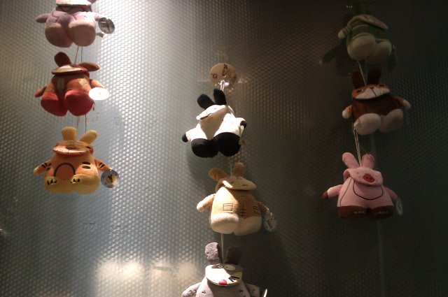 在玻璃上悬挂着各种可爱的玩偶,有种小可爱的感觉。
