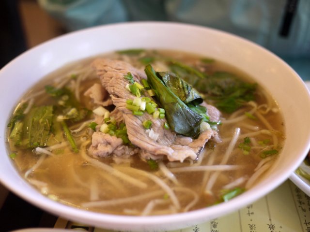 服务员还会提醒河粉的汤熬了25个小时,建议先喝汤再根据自己喜好加辣椒和柠檬汁