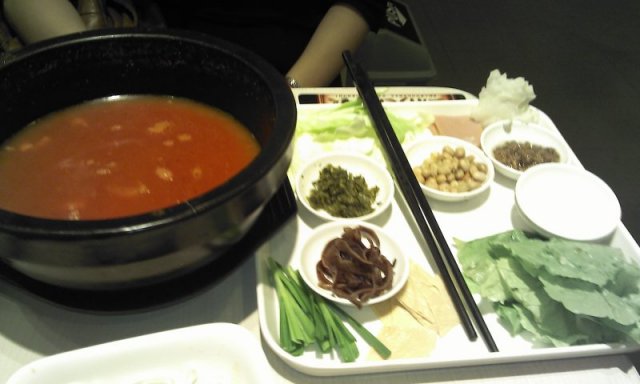 后来知道了 这个是这里米线的特色 叫碗8碟 里面蔬菜 花生 豆角 咸菜 黑(白)木耳 午餐肉等 全部放下去后 等2分钟 靠石锅的热量加热 米线很爽滑 里面料也很好吃