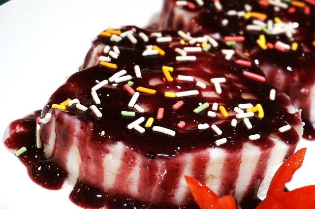 我觉得这个成本应该不低呐,因为看上去像山药切成这样,但其实吃起来他是泥,山药泥呐我爱的山药泥,软软的,好好吃,而且和蓝莓恰当好处!!