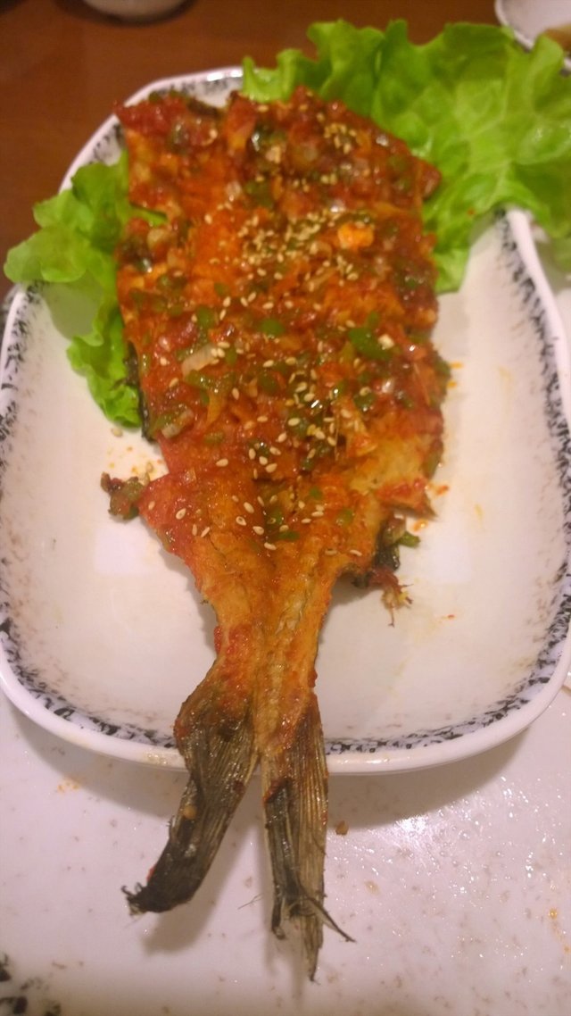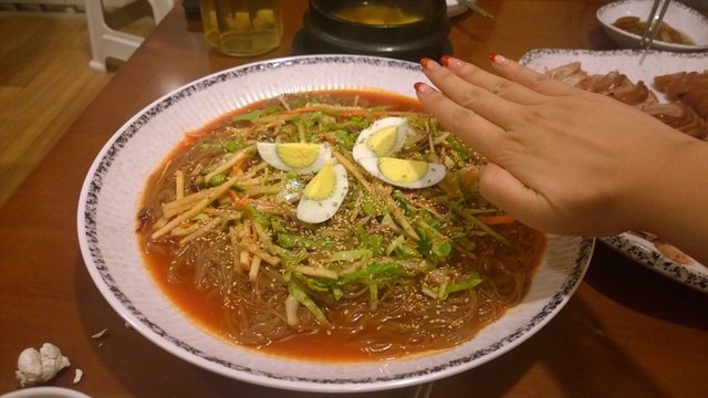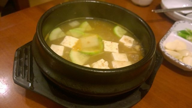 最先上的是惯例赠送的小菜,好像和团购内容不大一样,比较喜欢里边的萝卜条,海带丝和豆芽也不错,都是韩国特色酱拌制的