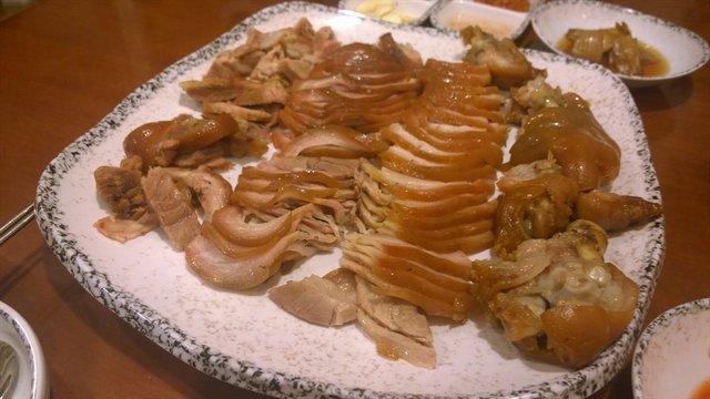 重点来了,今天的主角——王猪蹄宝膳,价值138,旁边是猪蹄,中间是肘子吧,相比来说觉得猪蹄给的少了点,因为是猪蹄名家嘛,不过反而是觉得那个切好的肘子肉要比猪蹄好吃一点,原因是猪蹄的毛没有处理干净,而且刚上来的时候有点烀烂的感觉,但是放置一会,也就是最后再吃的时候又会有点硬,就不如那个切好的肉品质如一了,味道吃不出很重的香料味,但是咸淡我的口也刚刚好,基本不再蘸酱料,当然我属于口轻的,另外这个还可以包着生菜吃,可能是天冷的原因,生菜有点吃不动