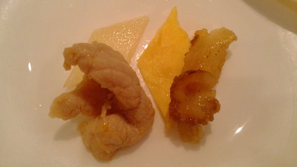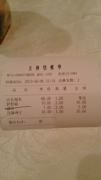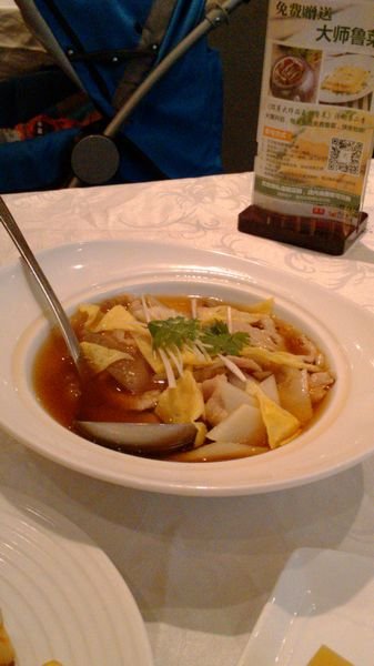 山东海参 送的那个菜 原价要68 料挺足的 关键汤很鲜 有肉片 笋 鸡蛋皮 海参 碗底还有海米 这是最后擦看到