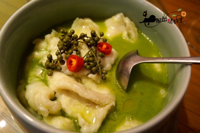 鲜花椒滚鱼片,这是我最爱吃的一道菜呀!汤是用蔬菜榨的,所以是绿的,龙利鱼没有刺,非常嫩,夹起来又不会散。一抢而空可以说。108块。