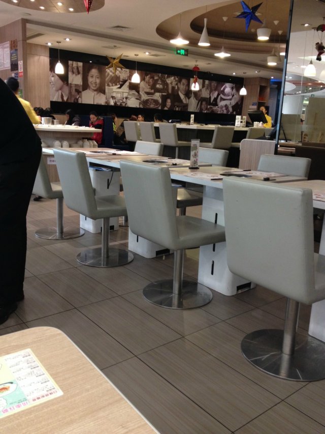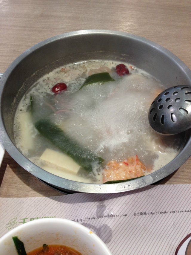 团购的捞面去的。 环境还不错, 整个大厅装修的现代、简洁、明亮, 给人宽敞、舒服的感觉。 进去就是圆形的自助调料区, 调料很丰富,有沙茶酱、香菜、香葱、牛肉酱、小米辣...... 服务员很快填好了点菜单。 不一会儿菜就端上来了, 捞面我点的是紫薯,大约就二两左右吧, 鱼皮饺、脆皮肠都是大约两三个吧。 我自己又额外点了一份梅花肉,18元。 汤底点的是大家评价甚高的骨汤锅。 应该是棒子骨熬的汤吧, 说是没有添加味精什么的, 吃面之前,先喝了一碗骨汤, 接近乳白色的汤水,味道非常鲜美, 梅花肉切成薄片,比较瘦,肉质好, 吃起来跟看起来一样,很新鲜。 下锅煮一会儿就OK了。 鱼皮饺和脆皮肠很一般般, 属于无功无过吧。 捞面,不能在锅里煮久了, 三分钟就可以了。 捞起来,拌上自助区自己ZIY的调料, 马马虎虎将就吧。 整顿饭感觉大骨汤是个亮点, 好喝、健康, 冬天吃起来非常暖和, 对已吃习惯了香辣的四川人, 换成这种相对而言比较清淡的吃法也是一种不错的选择。