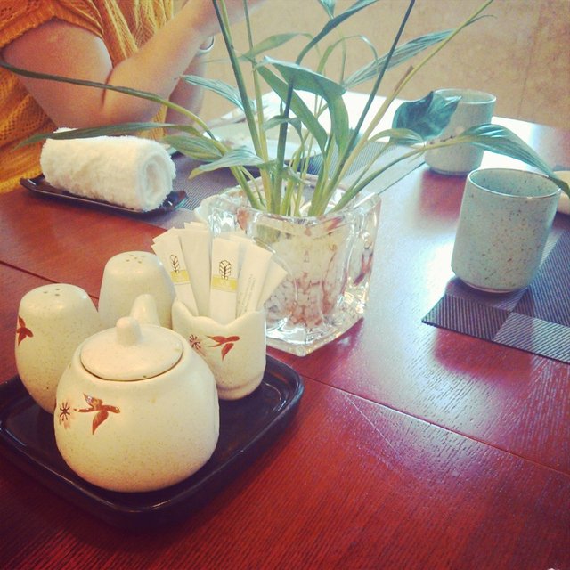都是一个系列的,带着好看的日式风格的小花。淡绿色的,看起来很典雅,和餐厅的名字也很相配~