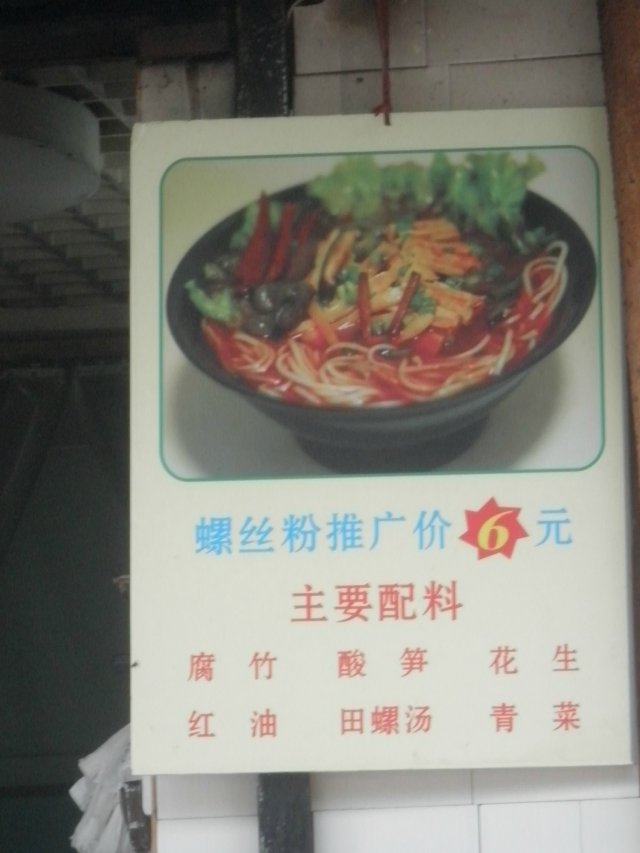只要6元,招牌上标明 的腐竹、酸笋、花生、青菜确实都有,红油看得出来,不知道是不是地沟油,至于田螺汤就不得而知了,我没喝出来~