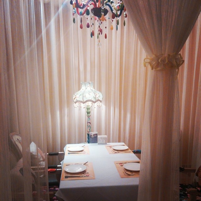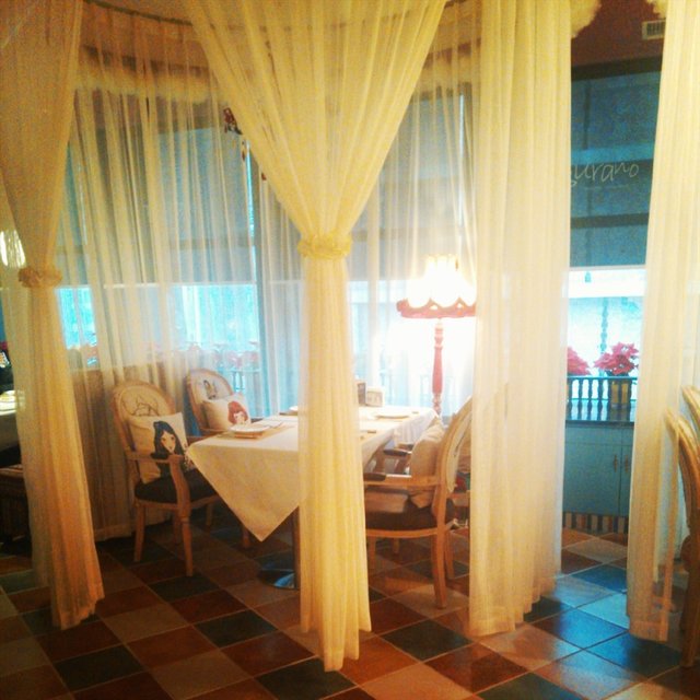靠墙的卡座全都是被白色的纱帘包围的隔了开来,很有约会的气氛, 这里的靠垫也全都很漂亮。