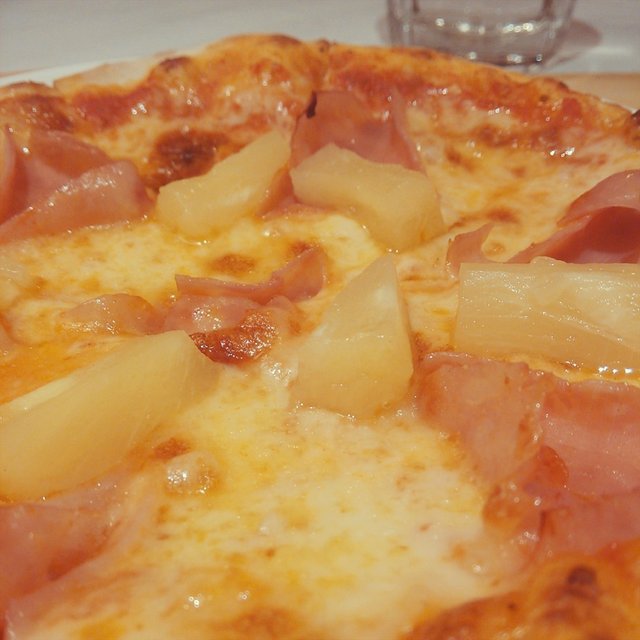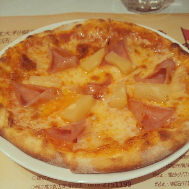 披萨的卖相还不错,色泽金黄饱满,上面的菠萝跟火腿也不少。