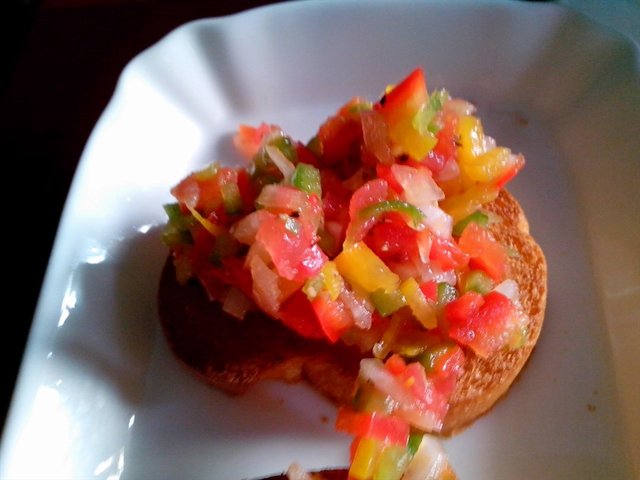 还有一份儿面包上面是青椒黄椒和西红柿碎丁儿,吃起来味道十分清爽。