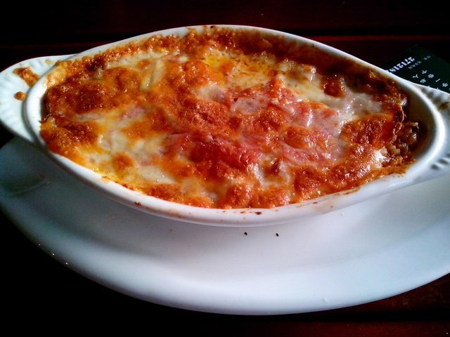 芝士焗萨拉米饭1份40元。中规中矩的焗饭,芝士不少,可以拔丝,奶味挺足。萨拉米香肠片跟前面的管面比起来就少了很多,不过整体来说味道也是很不错的。