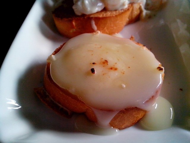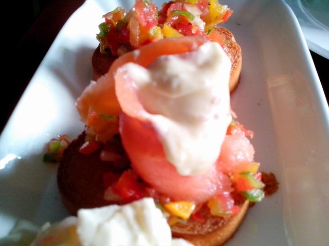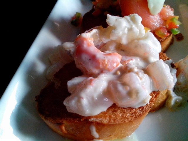 意大利脆皮面包1份32元。这个要强烈推荐一下,之前没有吃过的呢,端上来是一个白色的长条盘子里面放着四片烤面包,每一片烤面包上面放着不同的食材。