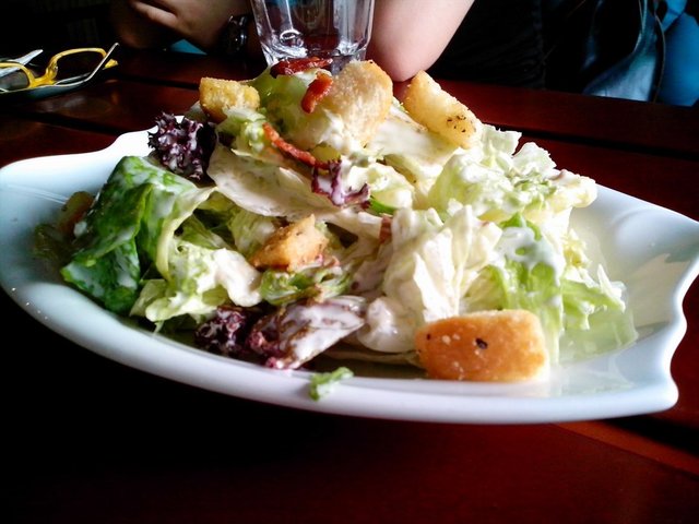 凯撒沙拉1份32元。沙拉很大的一份儿,以生菜为主,伴有切得很小的培根块儿,里面还有烤面包块儿,沙拉酱味道浓郁,而且搅拌得十分均匀,所有的蔬菜上面都蘸着酱汁,味道很不错。