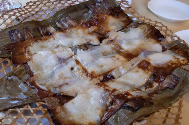 鱼片上下各盖一条大葱叶,在竹网上烤出来的。