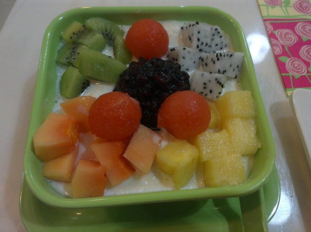 杂果,其实是各种水果的拼,有火龙果,芒果、菠萝等等,大概有6个品种吧。中间堆着一个黑糯米,下面是加了冰和奶的麦片碎,胃口小一点的女孩子,估计可以把这个当做晚餐了。