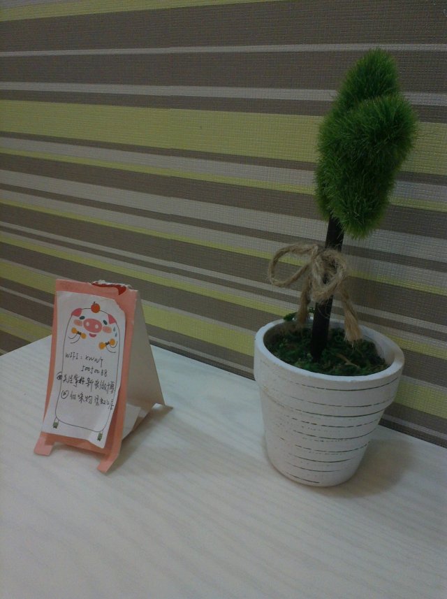 店面不大,但是布置的很温馨,店家没有用太多复杂的刻意的装饰,简单却很适宜,比如桌上小小的植物摆设,比如简洁的便利贴上写着店里的无线网络和密码。