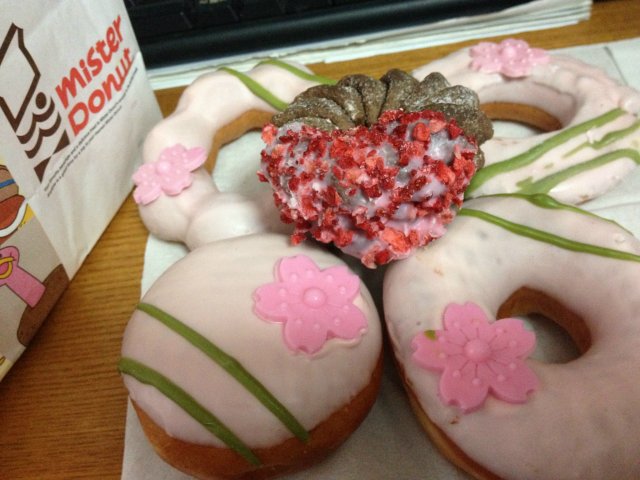 前阵子正直樱花季,所以推出了樱花口味的甜甜圈。粉粉的颜色就非常惹人喜爱,上面还有一片用巧克力做成的樱花。甜甜圈很香糯,不过还是略微甜口了点,要知道甜甜圈是经过油炸做成的,热量还是很高的,偶尔吃吃还是可以的。