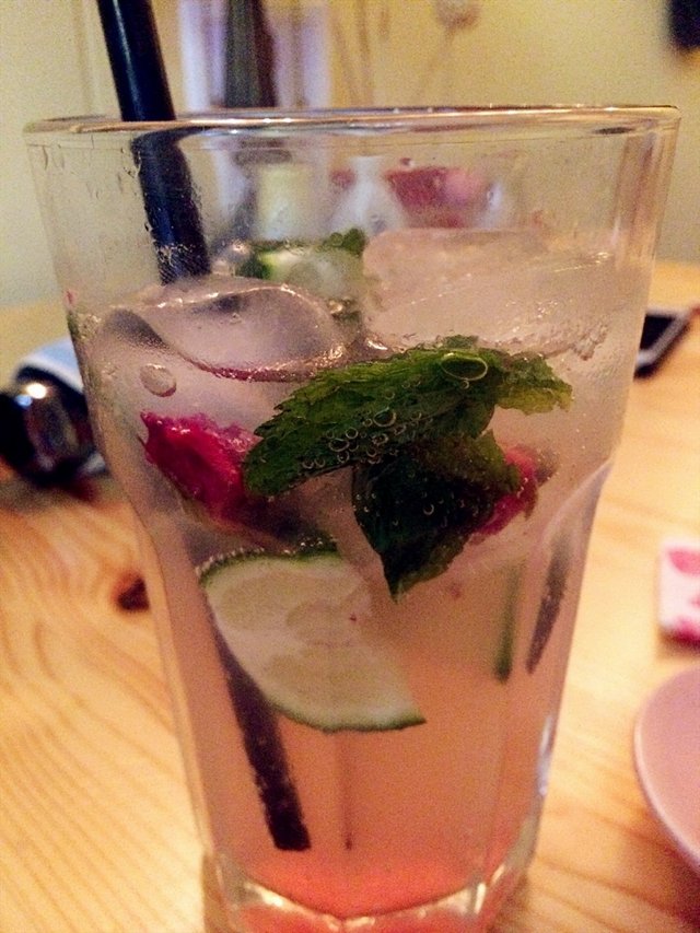 玫瑰MOJITO,杯底淡淡的粉色看着就好诱人的说。薄荷叶、青柠檬和玫瑰花的组合,颜色搭配好有爱。喝起来有浓郁的薄荷味道,微酸,爽口。