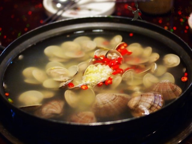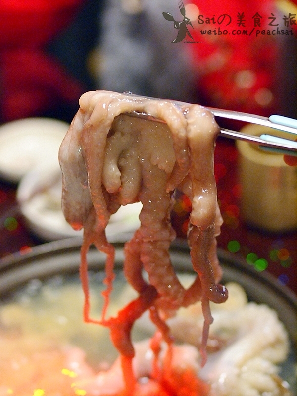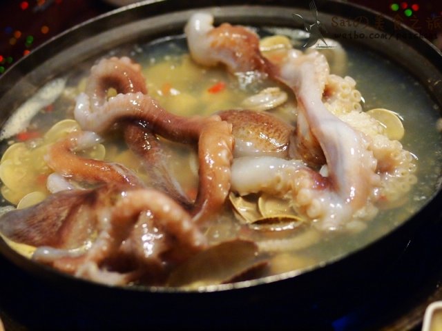 V5的活章鱼火锅来了,里面放了小米椒,鲜辣,2只硕大的章鱼下锅,混着贝类一起煮,章鱼一会就不扑腾了,服务员会来帮着切分,活章鱼口感是Q跟冰鲜的就是不同,沾点桌上的特味酱油吃,真的鲜的眉毛掉,吃章鱼脑袋是要有点本事,里面一包墨鱼汁,据说非常养颜,吮吸吧,哈哈;吃完放点蔬菜和面食煮煮,一点不浪费,面条很弹,倒些酱油下去,鲜!