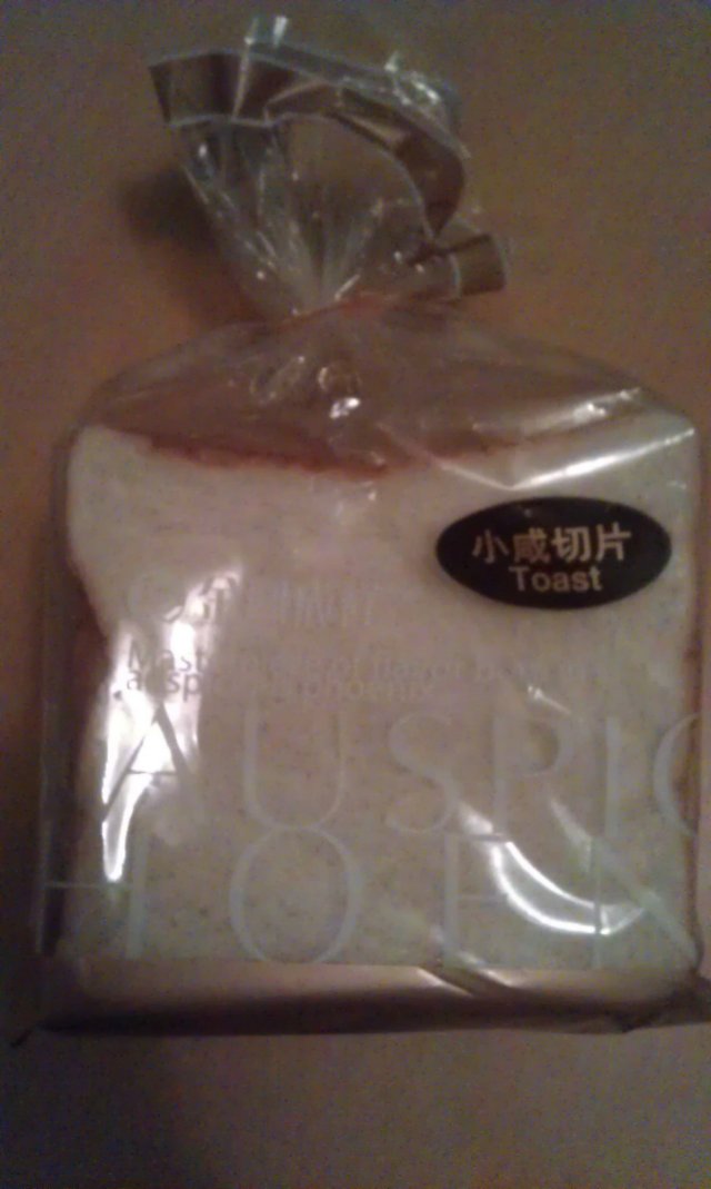 2、小咸切片,里面有8片左右,挺实在的包装,略带咸味,抹酱吃也不错,挺松软的面包片。