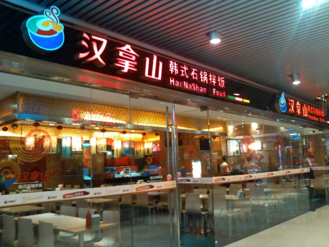 他家不是汉拿山的烤肉店,是汉拿山韩式石锅拌饭快餐店,在建国路81号华贸中心B1楼B118A号,中午的时候人山人海的,全都是周围写字楼的白领,其他时间就显得冷冷清清,冰火两重天的感觉,不过附近的餐厅多数都是这样;环境卫生都还算挺好,标准快餐店布局,椅子不舒服,木头的,餐厅显得很透亮,管理水平消费者还是放心的;服务也说得过去,只要不是最高峰去服务挺周到的.
