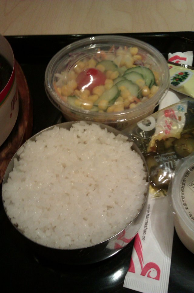 蔬菜沙拉很清口,不用千岛酱直接吃也不错,弥补了蔬菜少的缺陷~~~米饭可以配米条吃~~