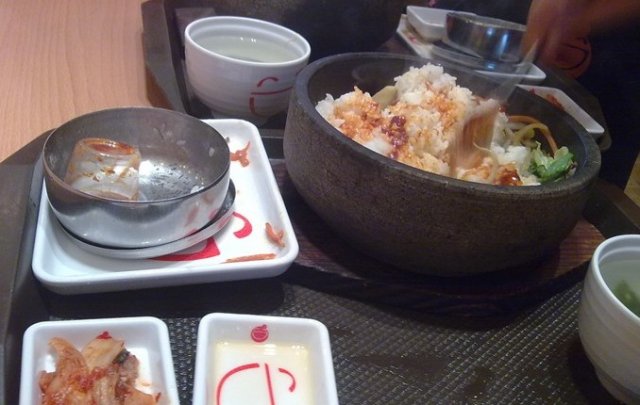 @牛肉石锅拌饭,这里主要就是吃石锅拌饭,但是这个不是我点的,我另外几个同学都点了石锅拌饭么,我感觉都差不多的,味道倒都还行。她是先把那个石锅烤得滚滚烫,然后端上来,把肉啦,菜啦,饭啦倒进去开始拌,再加了点料,基本上我看她们都吃光了,说明还是不错的
