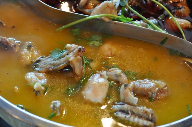金汤酸中带鲜,辣锅底香辣有味。稻香蛙肉质非常嫩滑细腻,很是鲜美。