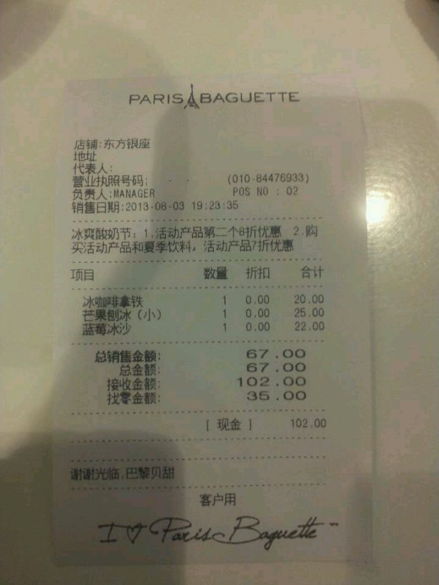 第一次巴黎贝甜 awgaoheng等級32013-10-149 浏览 关注 跟朋友逛银座累了,想找个水吧,结果全都满座了,结果溜达看见 巴黎贝甜里面有空位置,就去喝了点饮料。 点了冰咖啡拿铁、芒果刨冰、蓝莓冰沙 芒果刨冰挺不错,芒果很喜欢 蓝莓冰沙挺甜的 稍微有点过 他家的蛋糕过生日时买过 挺不错的以上食记乃用户个人意见 , 并不代表OpenRice之观点。赞好分享第一次巴黎贝甜 巴黎贝甜PARIS BAGUETTE https://s.openrice.com/KtbT1m0siK700检举 张贴 评分5味道5环境5服务5卫生5抵食