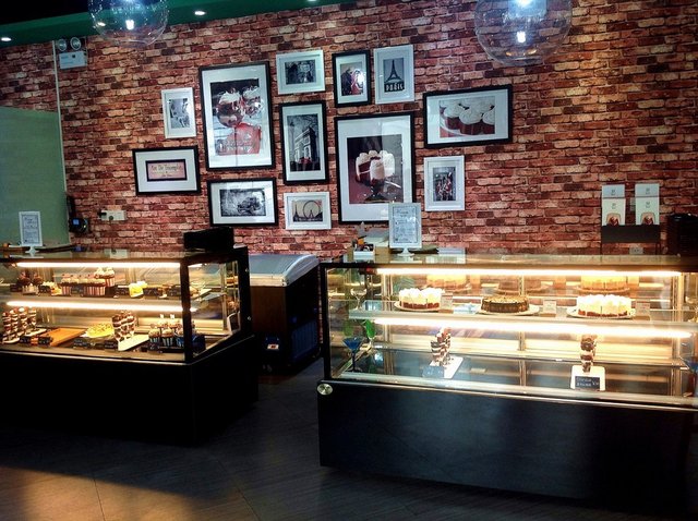 进到店内.橱柜后面是照片的展示墙,展柜里面放置这蛋糕.