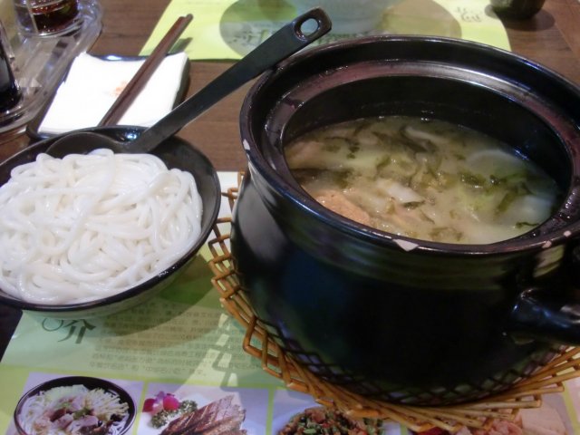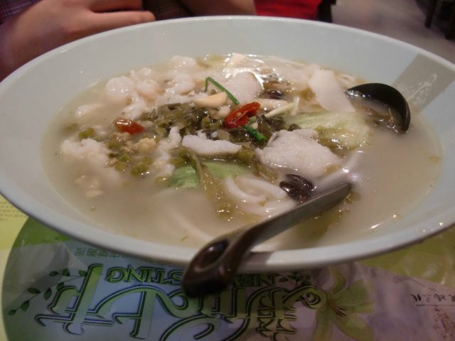 汤色乳白,因为加了酸菜,所以味道是鲜中带着较重的酸味。