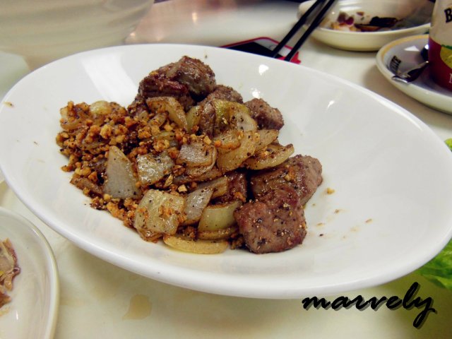 点这道菜,是因为鸡肉啊,猪肉啊,都点过了,想点一道和牛肉有关的菜,于是在菜单为数不多的牛肉类的菜肴里选择了这道蒜香一口牛柳。不过在点单的时候,店员强调说这道牛肉不能炒的太久,否则会咬不动,所以如果我们看到牛肉粒里有血丝是正常情况。上桌后的蒜香一口牛柳,被切成正方形的小方块,和之前火车头里的牛肉粒大小一样,上面的确还留有点点的红血丝,配料里有切成块的洋葱和炒花生碎。可是估计厨师还是算错了火候,这牛肉粒第一口咬下去,有一股汁水包裹在里面,但是再咬,咬不动了。最后我也无法将它嚼烂咽下,只能浑囵吞了。