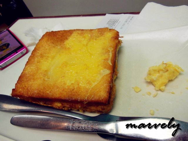 主食和点心我们另外还点了黄金“咖椰”西多士,22元。看到“咖椰”两个字没有,其实西多士上面涂的那一层,就是咖椰酱,既然有椰字,自然就有椰浆了,不清楚西多士上除了咖椰之外,还有没有加入其他的和糖有关的作料之后才油炸的,总之这个黄金西多士,有点甜。