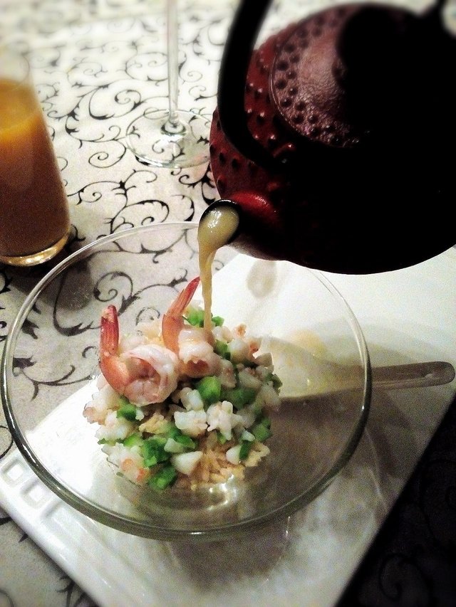 倒入浓浓的虾汤,即使泡很久,香米还是很脆