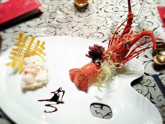 佐以写着“粤”的酱料,而龙虾壳则保存完整