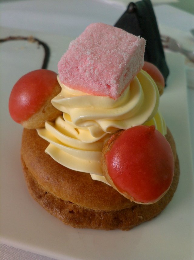 这到甜点的名字,让我首先联想到的却是意大利。这个颜色很是可爱的甜品,就像它看起来的那样,很是甜美,黄色冻奶油的下面,还铺着一层草莓酱,下面垫底的面包同样走了甜甜的线路,这个圣托里尼,是从头甜到尾啊。