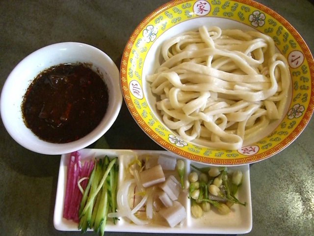 给猪点的,也是为了和印象小馆对比一下~端上来我俩都看傻了,可谓大跌眼镜!这量也太太太袖珍了吧?面条只有拳头大小一小坨啊,没印象小馆一半多!更别提老北京那种海碗了~本身面这东西也不值钱,咋就不多给两根呀?倒是适合正在减肥的MM,吼吼!好在面条手擀的,炸酱里还有看得见的肉丁,但综合来说性价比不高~