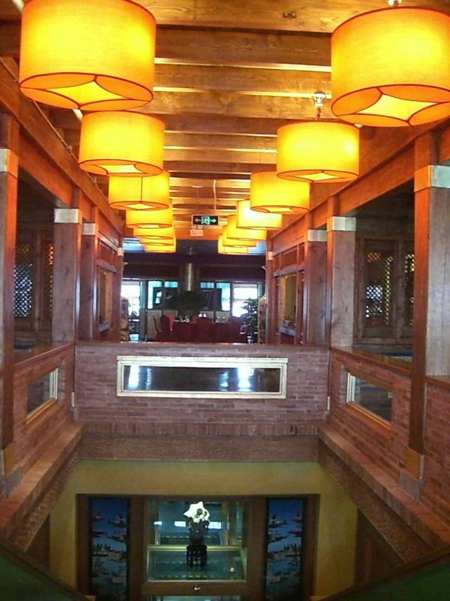 进门迎面一块牌匾上写着:何事惊慌。一楼梯把角挂着鸟笼,里面有只会叫的鹩哥,不免联想到八旗子弟遗风提笼挂鸟。上二楼,宽敞明亮,大红灯笼高高挂,即使白天也映衬得很漂亮。桌椅板凳都是仿清风格,餐具精致,菜单有三大本,感觉挺讲究~