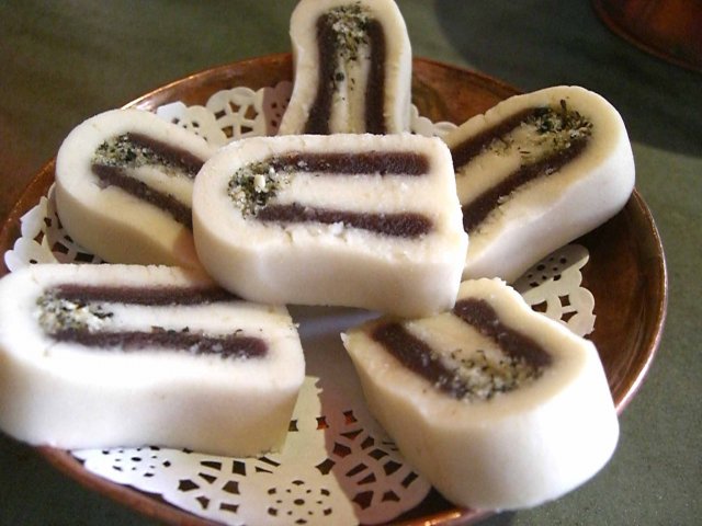 宫廷小点!芸豆磨得很细腻,里面卷着细腻的豆沙,点缀一抹黑芝麻调味,凉滋滋的,非常棒!