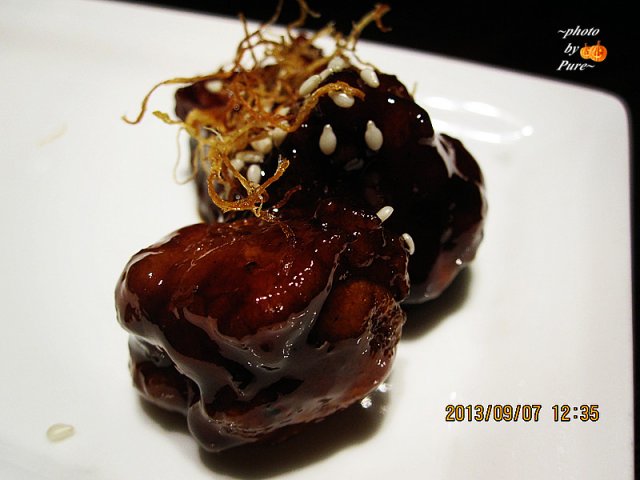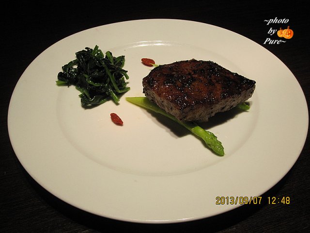 【烧汁牛小排,碧绿时蔬】中餐西做。牛小排的摆盘不亚于西餐厅。这里用餐的时候刀叉是必备。虽然没有事先询问几分熟。牛排一切上去就看到里面微红的肉混合着酱汁散发着扑鼻的香味。入口是传统的黑胡椒系的酱汁。小牛排下隐藏着2片蘑菇。搭配时蔬。到这里为止已经有七八分饱腹感